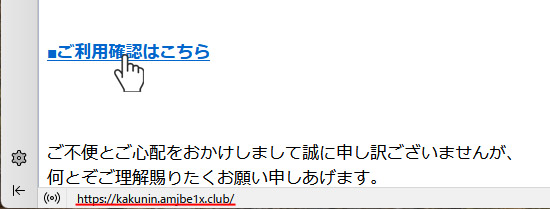 リンクにマウスカーソルを合わせると、リンク先がわかります。アメリカンエキスプレスとは全く関係ない URL になっており偽物です。